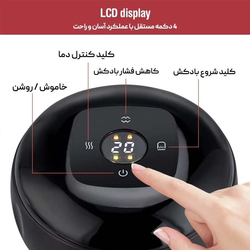 - کنترل کامل: چهار دکمه مستقل برای تنظیم حالت دستگاه، شدت مکش، دمای گرمایش و تعلیق عملکرد بادکش جهت کاهش فشار.
