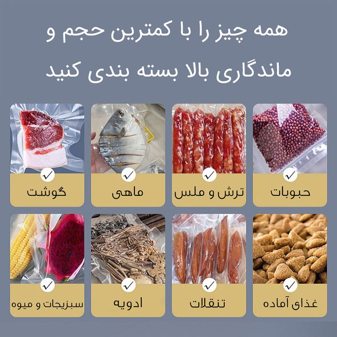 برای بستهبندی حرفهای میوه، سبزی، گوشت، خشکبار و هرچی که دوست داری تازگی بمونه. دیگه بوی بد یخچال، کپک زدن غذا یا بینظمی فریزر تمومه. هم وکیوم میکنه، هم پرس — فقط با یه دکمه!